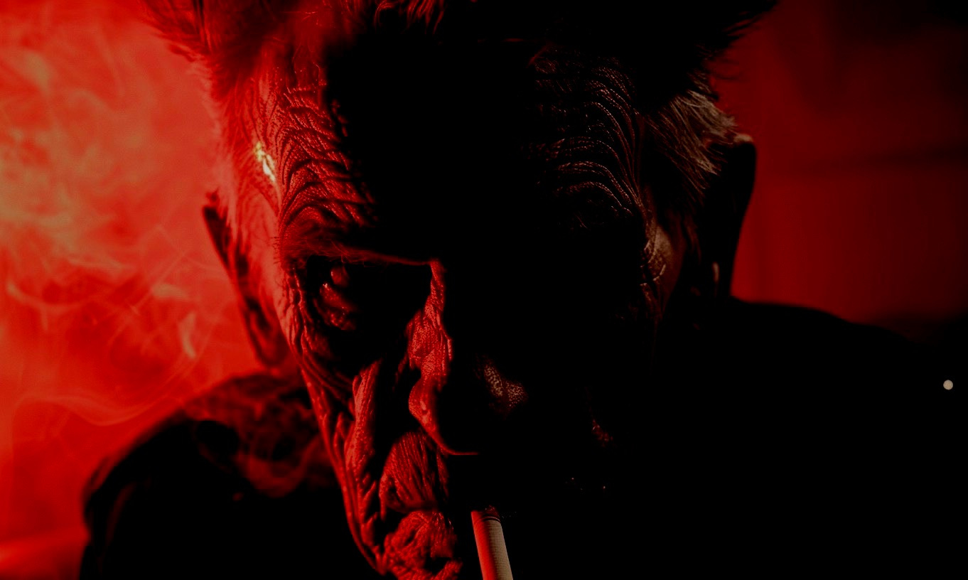 Ed the Ted’s face dominates the Study’s screen, a gargoyle carved out of darkness by burgundy light. Smoke coils around his head like a stage effect in a shabby down-at-heels pantomime.