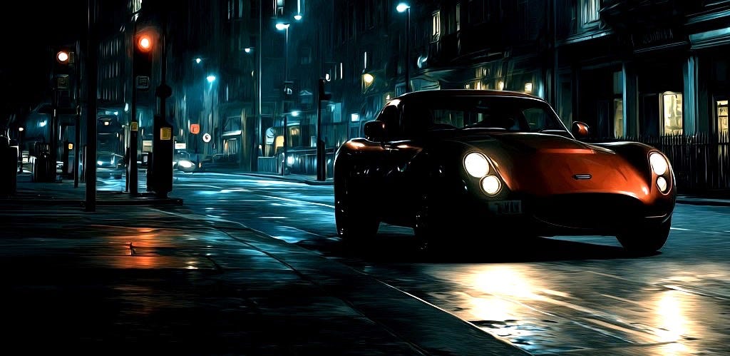 London is apocalypse spooky. Dark empty streets. Traffic lights blinking at ghosts. Barely a scatter of lights in the buildings close by. The thunder of the coupe echoes from their facades.