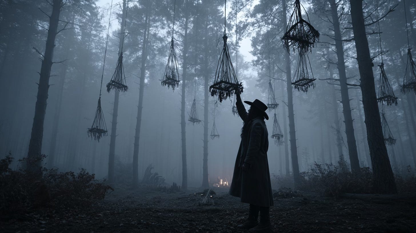 I lost count of the cages. Some were larger, some smaller. When the fog cleared I looked up to see more hanging from higher branches. Each one filled with remains.