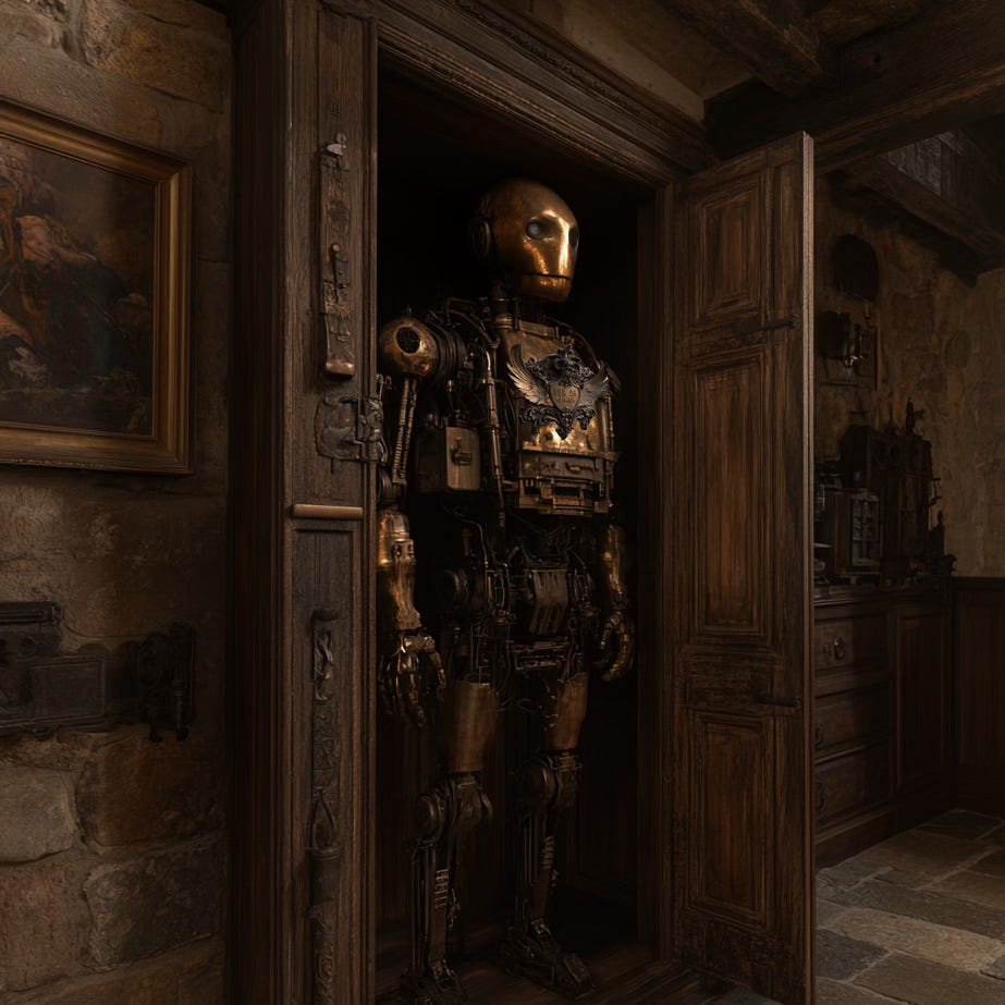 Mr. Mephisto filled the wardrobe, which he now realised was a tool cabinet, as there were alcoves lined with black velvet to either side of the main machine. In these alcoves were stored spare hands and spare limbs, devices that perhaps had roles deep inside the machine, and a collection of hand tools laid out to be easily accessible. Mr. Mephisto was secured by wide straps made from thick, heavy leather across its arms, legs, and chest, fastened by substantial metal buckles. Except for a light coating of dust, the machine was in good condition; some wear and scratches on the casing were apparent, but as the brothers remarked, not bad for a machine that had been in the family since Patra’s great-grandfather had brought it back from Milan by boat when he was a young man.